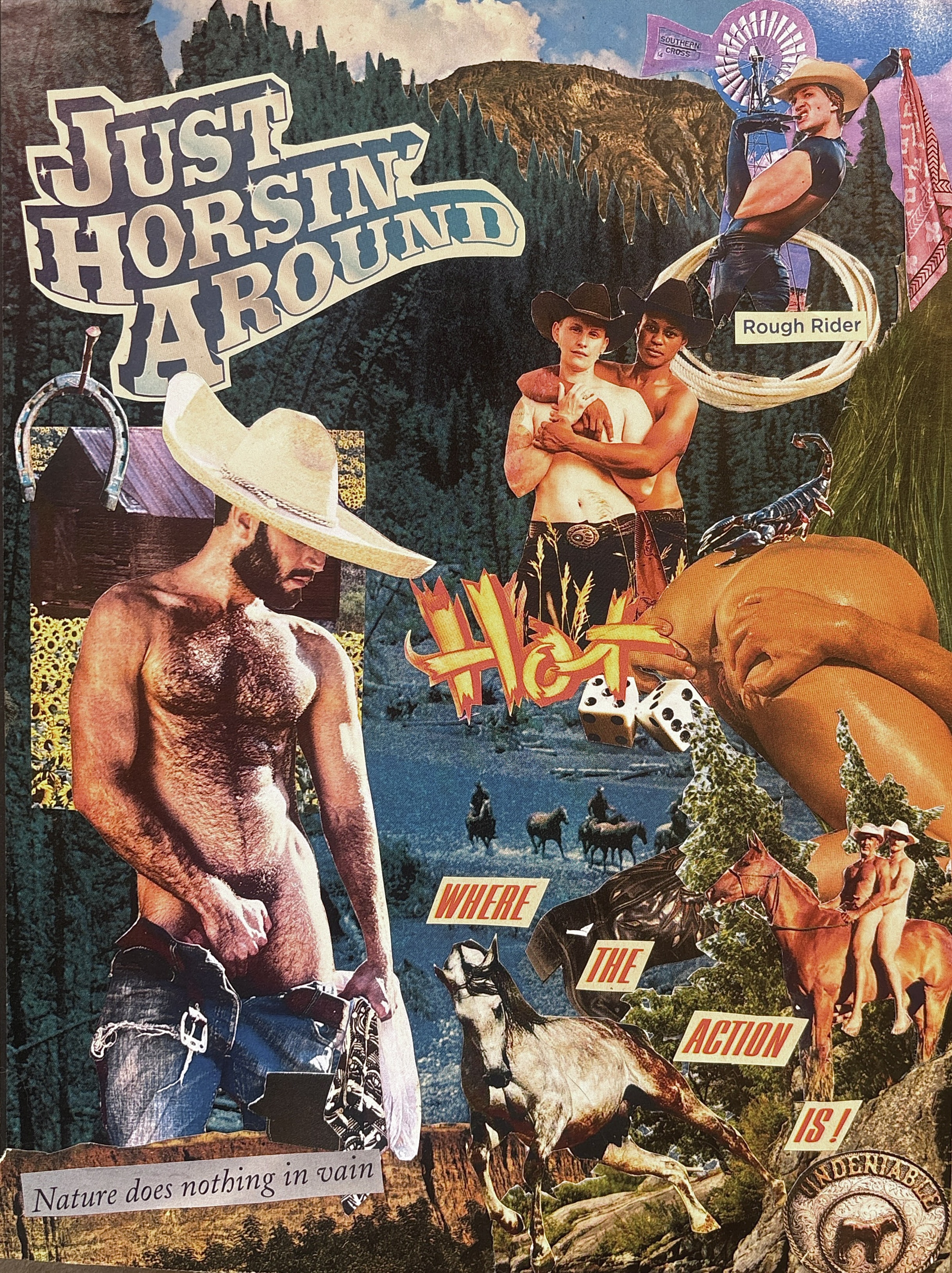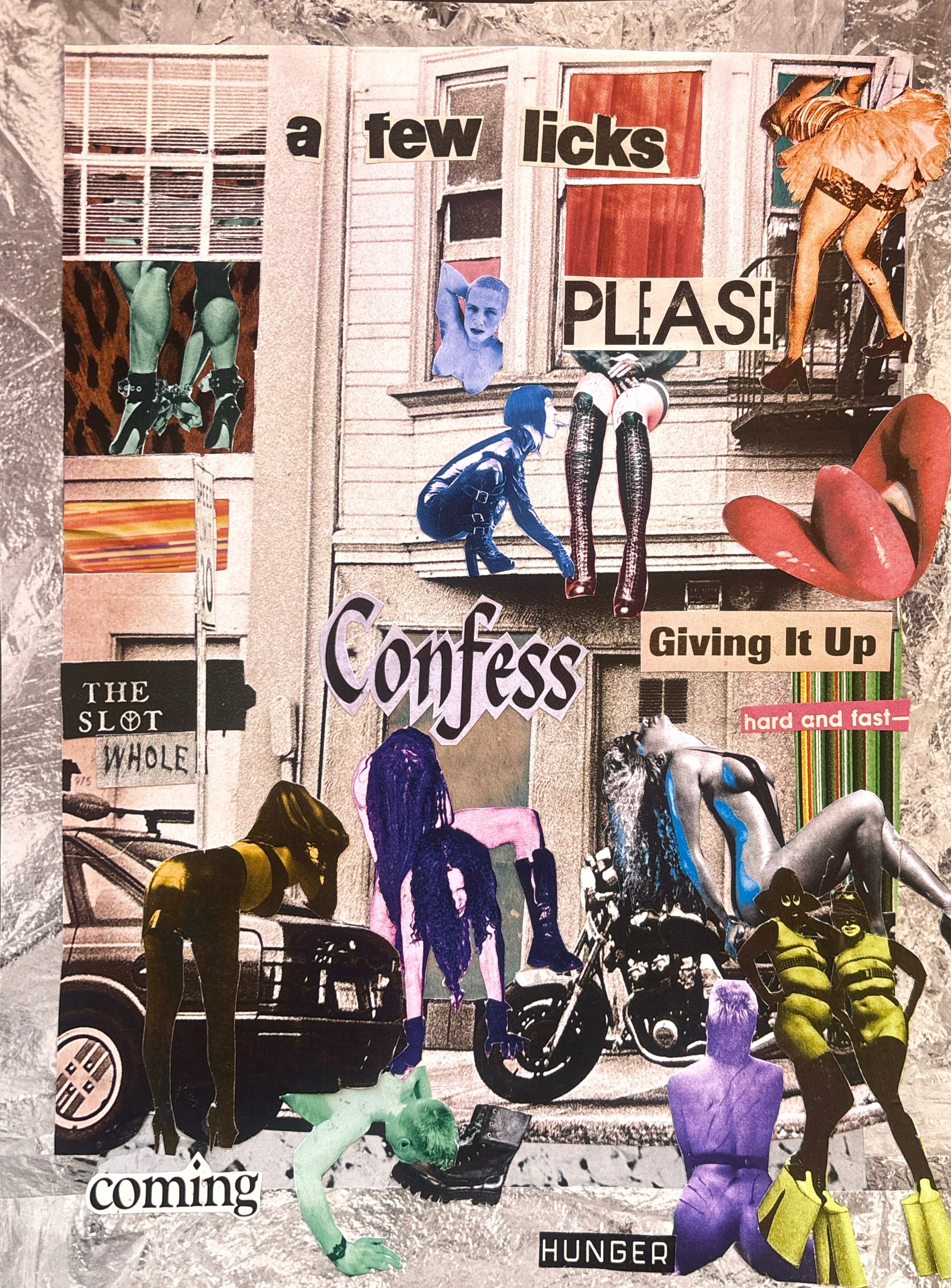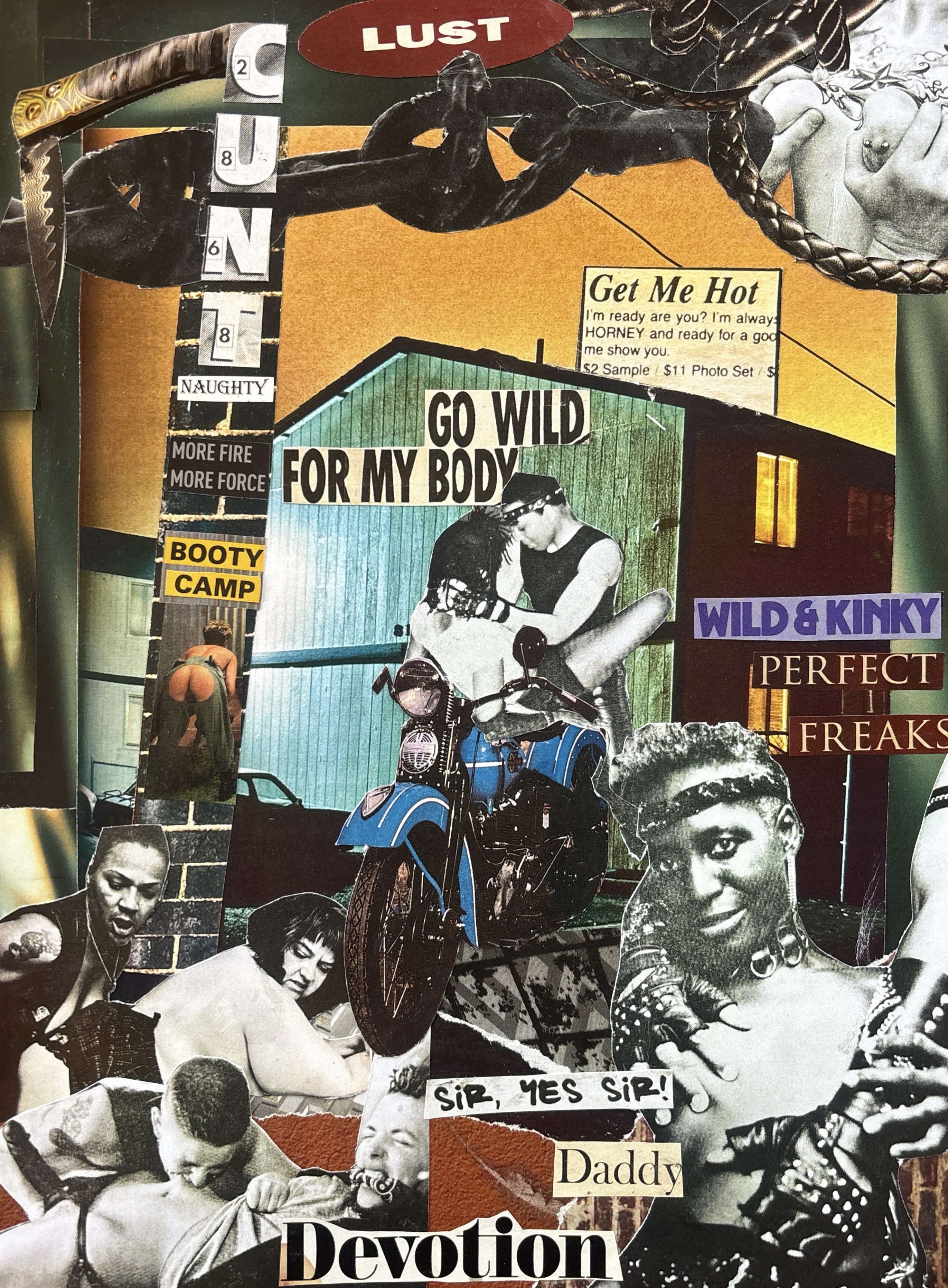 All of my materials are sourced through real media. I spend hours in archival libraries like Chicago’s own Gerber Hart & Leather Archives scanning images of queer perverts who’ve passed down the legacy we continue today.